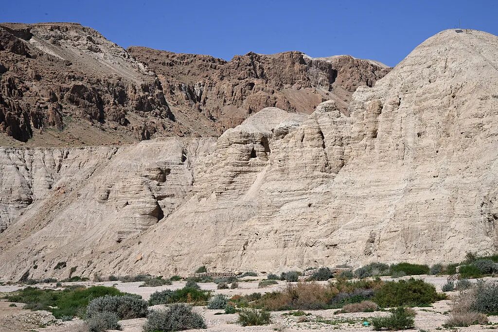 当地时间2026年2月21日,以色列库姆兰,沙漠山丘与洞穴景观。1947至1956年间,死海古卷在此地被发现。视觉中国资料图